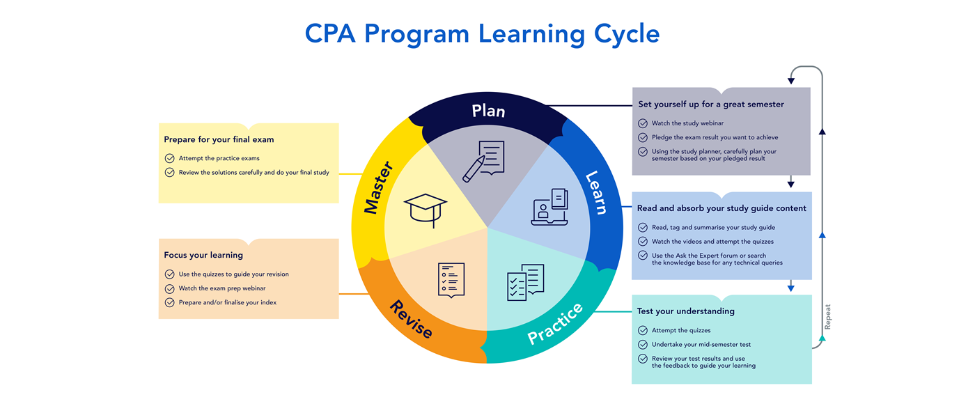 When approaching your studies in the CPA Program, it’s important to understand the range of support options available to help you succeed and study your way, on your terms. The core of your learning is the study guide, which contains all the examinable material for the CPA Program and should be considered your primary reference throughout the semester. Other resources, such as guided learning, professional tuition, webinars and quizzes are designed to complement the study guide and support different learning styles.